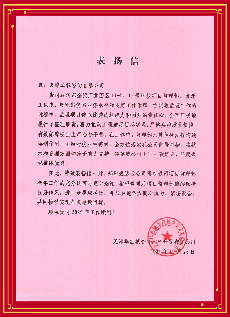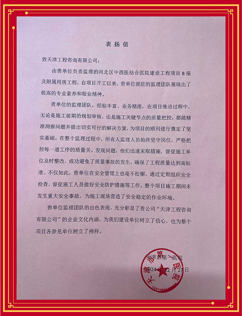 2024年,為持續深化“1264”戰略體系特別是“六化”舉措,加快推進實體化進程,天津咨詢順利完成吸收合并下屬成套監理公司,在持續打造天津咨詢品牌,以工程監理和項目管理為基礎,發揮在項目建設期的綜合專業優勢,逐步形成“監”“管”一體化服務模式方面邁出關鍵一步。近期,多家業主單位先后發來感謝信、表揚信,對天津咨詢承擔工程建設監理任務給予充分肯定。