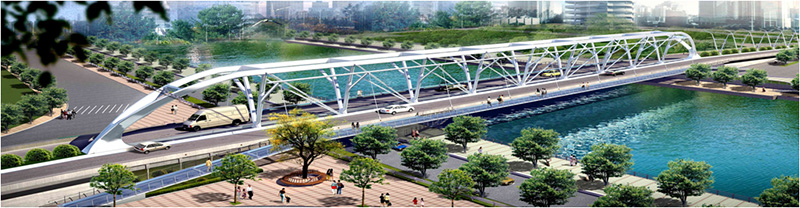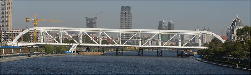 該橋橫跨張自忠路、海河以及海河東路。橋梁總長180米,主跨128米,面積4985.2 平米,為自錨式桁吊組合鋼結(jié)構(gòu)橋。總投資2.65億元。該橋梁設計在國內(nèi)外尚屬首創(chuàng)。